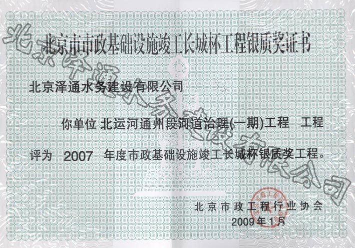 2007年度北京市市政基礎(chǔ)設(shè)施竣工長城杯工程銀質(zhì)獎證書